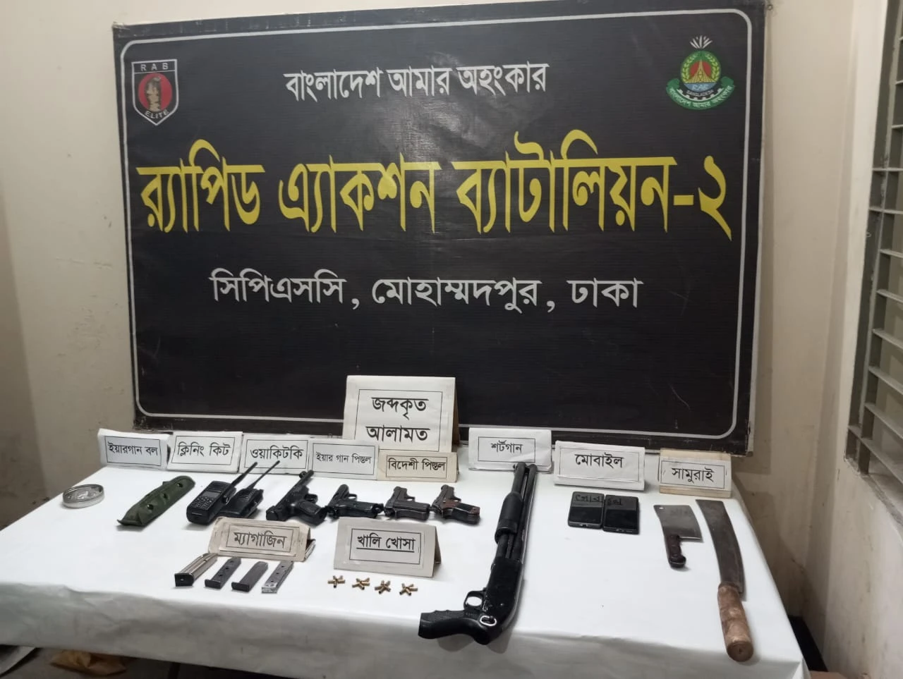 সন্ত্রাস বিরোধী অভিযানের অংশ হিসেবে গত( ২৯ সেপ্টেম্বর ২০২৫) রোজ সোমবার রাতে গোপন সংবাদের ভিত্তিতে র্যাব-২ জানতে পারে যে, রাজধানীর হাজারীবাগ থানাধীন বারৈইখালী বাজার এলাকায় একটি বাড়ীতে কতিপয় দুষ্কৃতিকারী অবৈধ মাদকদ্রব্য ও অস্ত্রসহ অবস্থান করে সন্ত্রাসী কার্যক্রমের পরিকল্পনা করছে। উক্ত সংবাদের ভিত্তিতে র্যাব-২ হাজারীবাগ থানাধীন বারৈইখালী বাজার এলাকায় রাতে একটি অভিযান পরিচালনা করে। অভিযান পরিচালনাকালে উক্ত স্থান হতে ১। মোঃ রবিউল ইসলাম (৩২) ও ২। শরিফুল ইসলাম শান্ত (২২) দুই অস্ত্র তারিখে গ্রেফতার করতে সক্ষম হয় জিজ্ঞাসাবাদ করে তাদের দেখানো মতে বাড়িটির ৫ম তলার উত্তর পাশের ফ্লাটের পশ্চিম পাশের রুমের তোষকের নিচ হতে উপরোক্ত