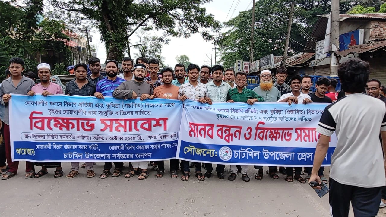 নোয়াখালীতে স্বতন্ত্র বিভাগ ঘোষণার দাবিতে মানববন্ধন ও বিক্ষোভ সমাবেশ হয়েছে।